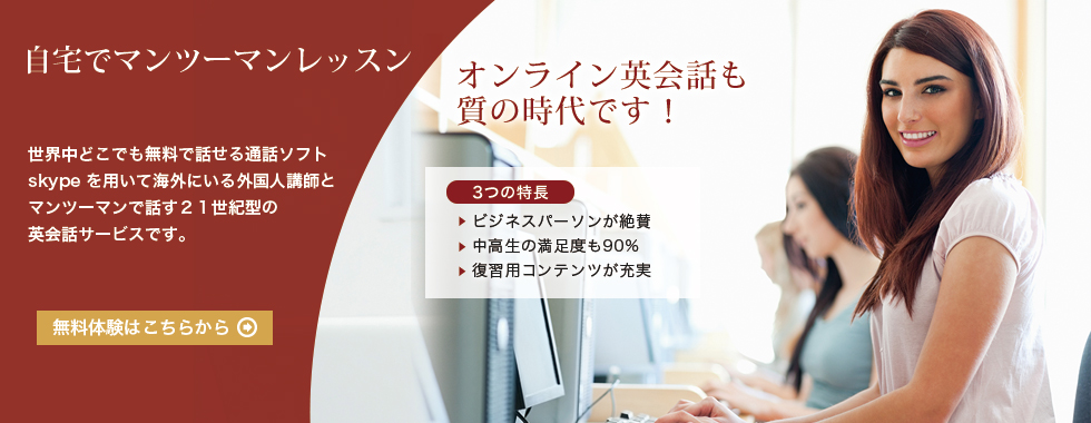 世界中どこでも無料で話せる通話ソフトSkypeTM、Google Hangout、Zoomその他のアプリケーションを用いて、海外にいる外国人講師と直接英語を話すトレーニングをすることができる英会話サービスです。海外に住む講師とのマンツーマンレッスンですが、Skype(スカイプ)などは無料のサービスであるため、インターネットにさえ接続できれば電話代もかかりません。